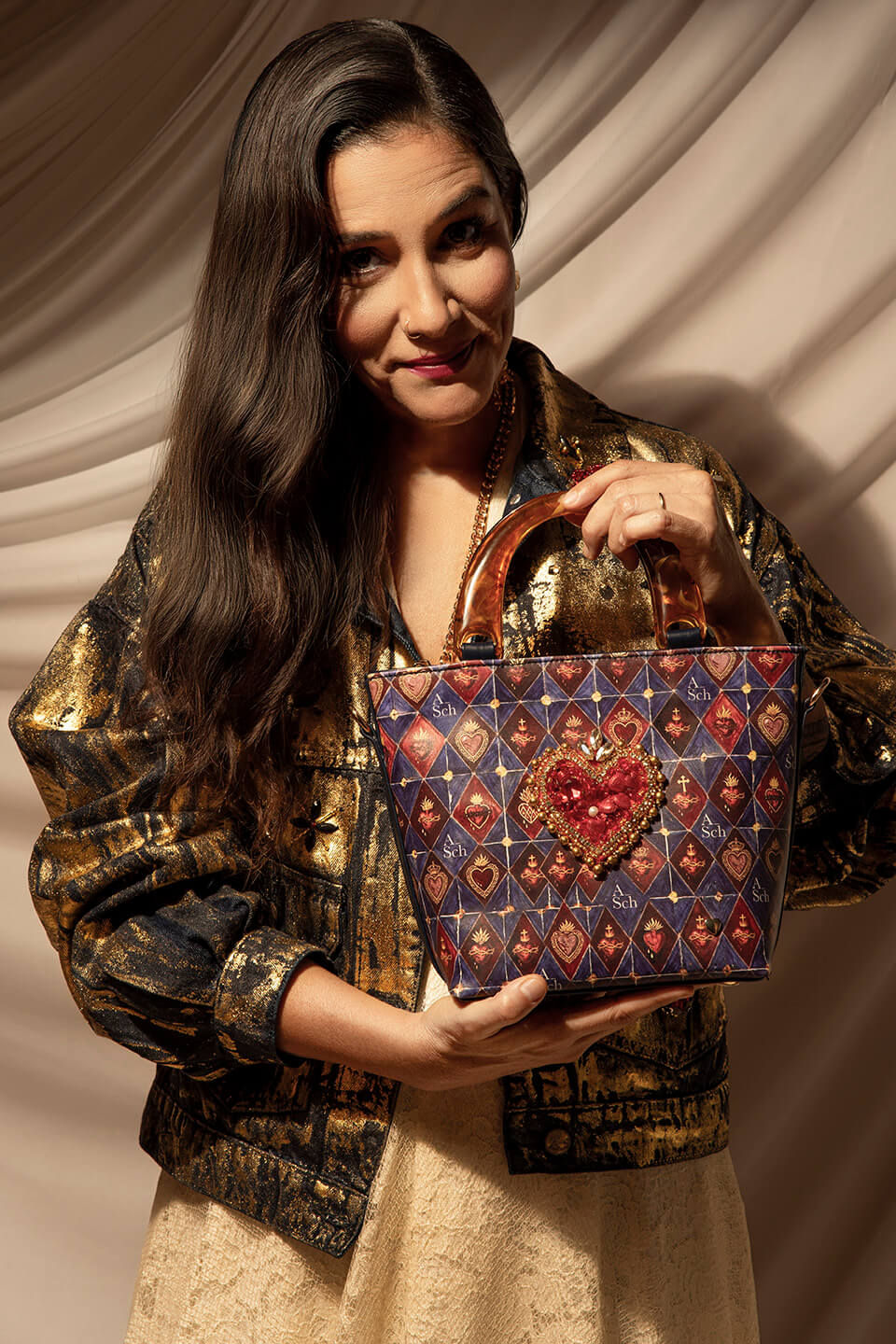 Carteras, maxi bolsos y una casaca soñada, pintada una por una con una técnica en foil dorado y bordada íntegramente a mano con piedras, cristales, perlas y muchísimos detalles.